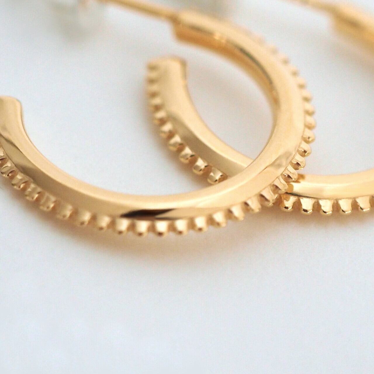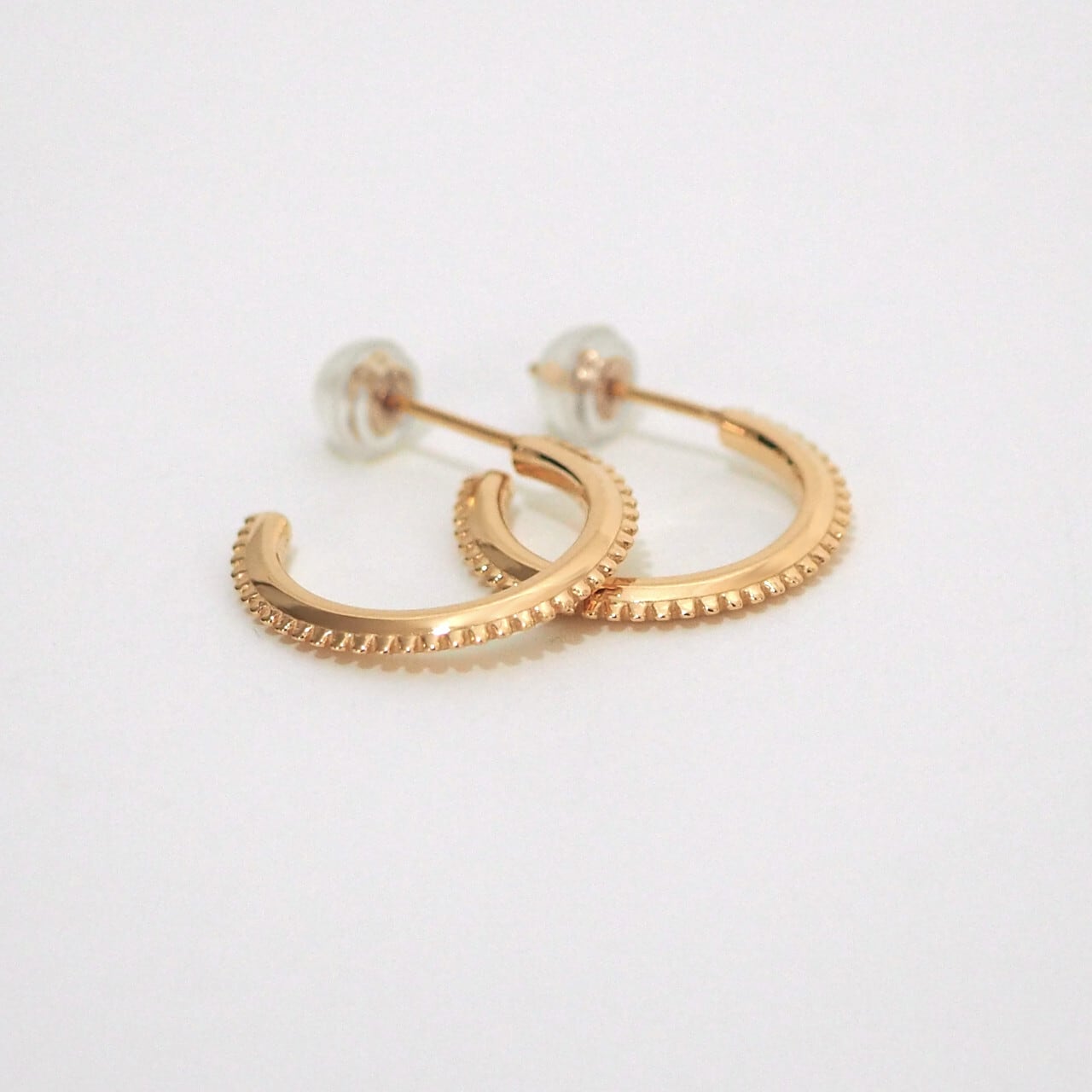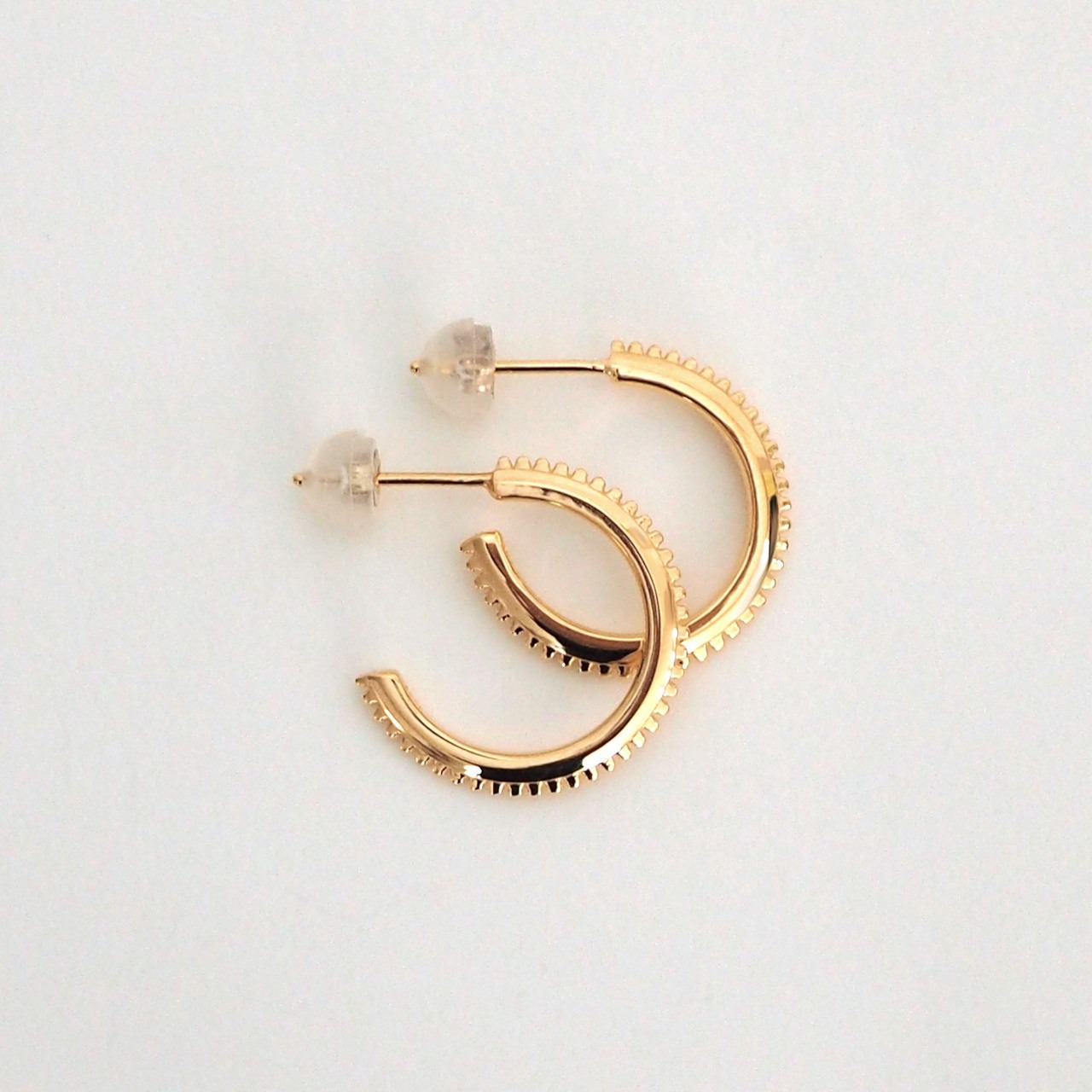 シンプルで使いやすいフープに極小のスタッズを配してシャープな印象に仕上げました。一見してスタッズに見えないのでカジュアルになりすぎずさりげなくお使いいただけます。本体はシルバー素材、ピアスポストとキャッチは10金素材を使用しています。キャッチ込みペアでの価格です。